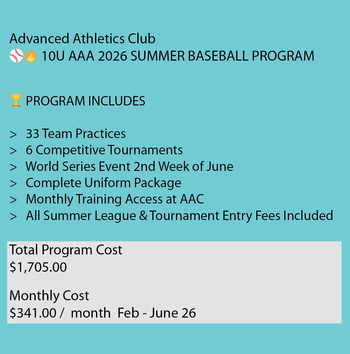 Program Includes Practices: 33 Team Practices Tournaments: 6 Competitive Tournaments Special Event: World Series Event (2nd week... see more